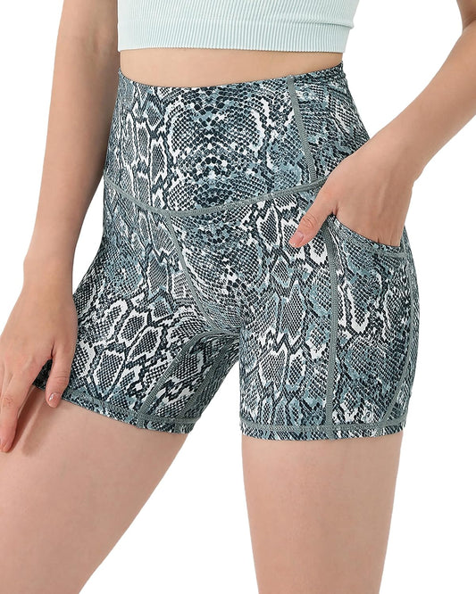 Women'S 5" High Waisted Pattern Biker Shorts with Pocket, Tummy Control Non See through Workout Exercise Printed Running Yoga Shorts, Grey Snake, Medium